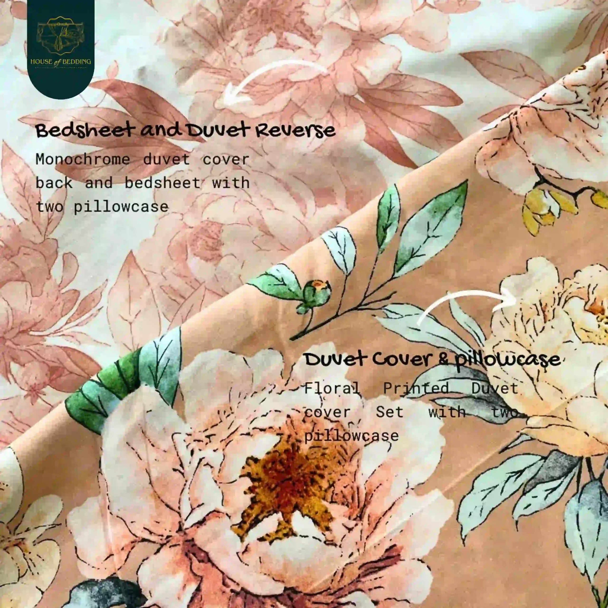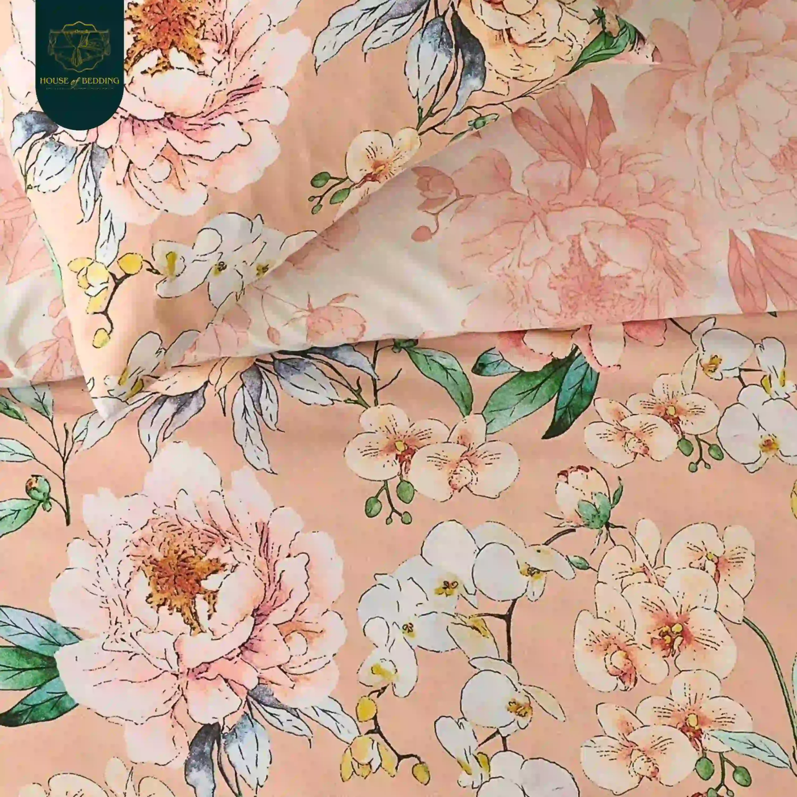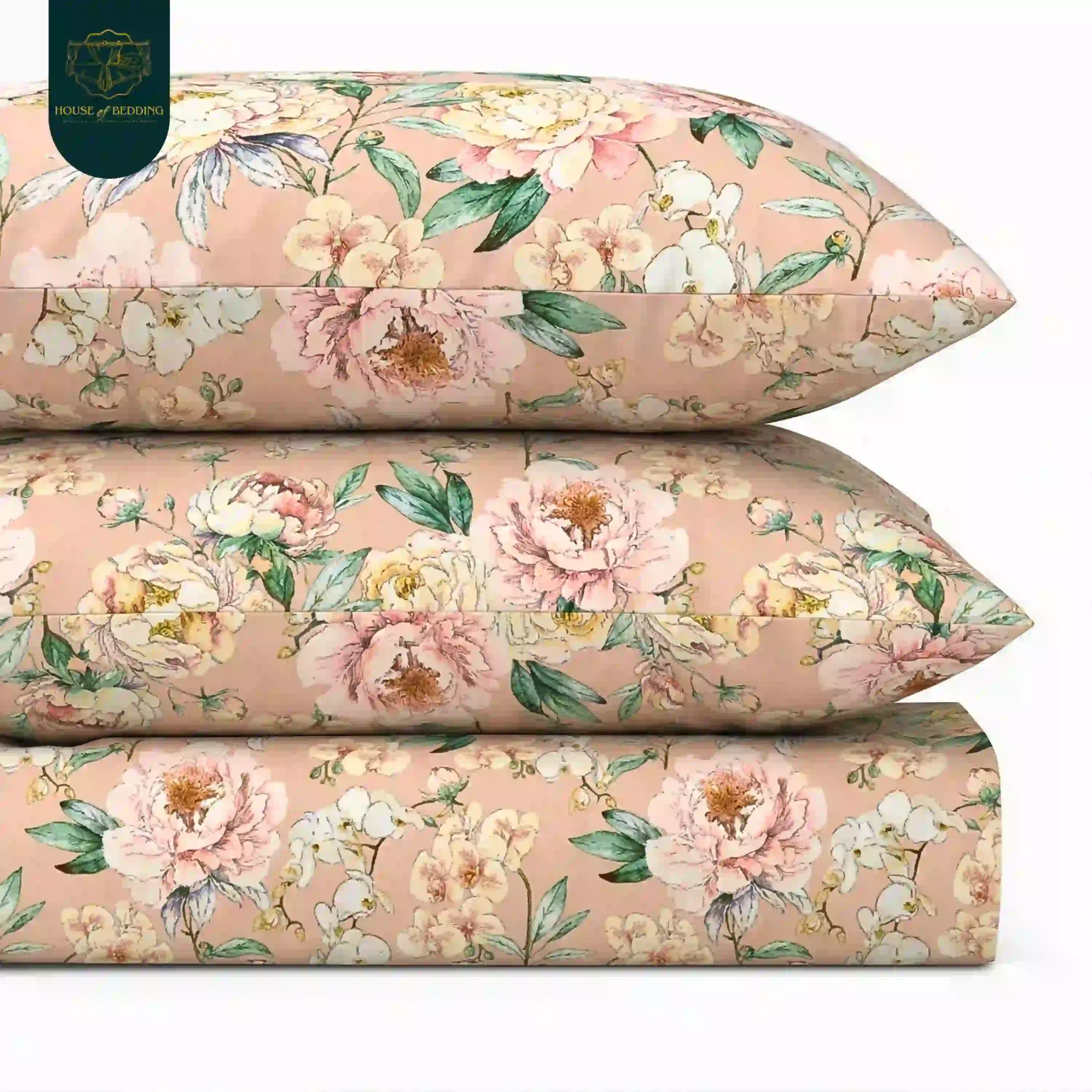 Sunrise Bloom: A 3-Pc Warm Peach Floral Cotton Sateen Bedsheet Set