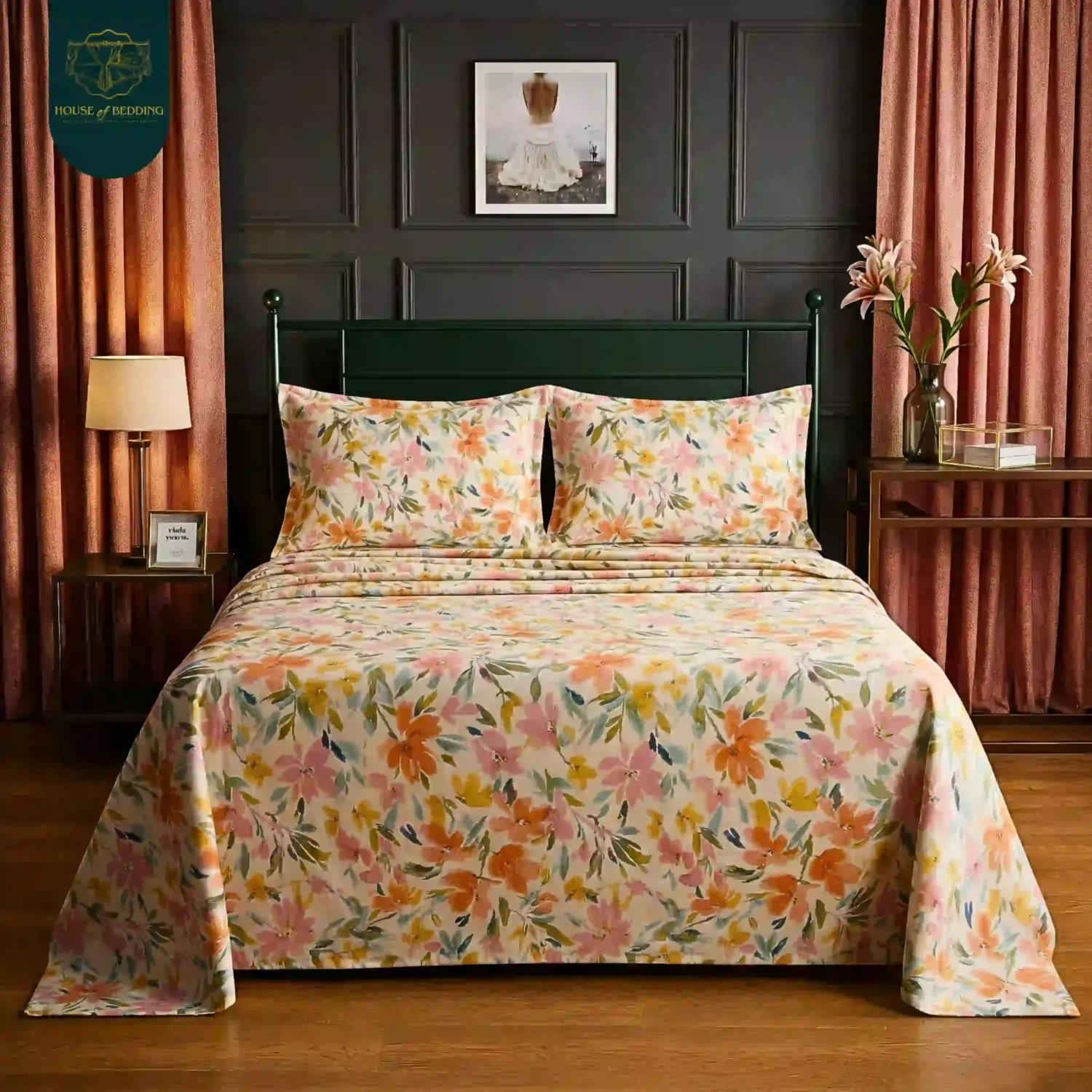 Sunrise Bloom: A 3-Pc Warm Peach Floral Cotton Sateen Bedsheet Set